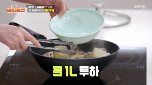 15. 닭에서 기름이 나오고 닭껍질이 노릇해지면, 물 1리터를 넣고 강불에서 10분간 끓여줍니다.