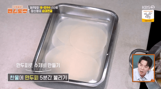 5. 만두피 10장을 찬물에 담가 5분간 불려줍니다.