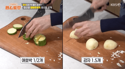 3. 애호박 1/2개를 반달모양으로 썰고, 감자 1.5개를 듬성듬성 썰어줍니다.