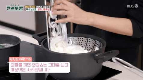 2. 찜기에 썬 양파를 넣고, 뚜껑을 닫은 뒤 강불에서 10분 간 쪄줍니다. (양파가 투명해질 때까지 쪄줍니다.)