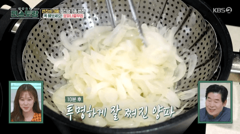 3. 찐 양파는 체에 밭쳐 물기를 빼줍니다. (양파를 찌면 매운맛이 사라집니다.)