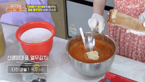 18. 생강청 1/2 국자, 다진 마늘을 넣고 섞어줍니다.