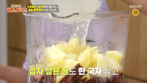 17. 개복숭아청 2 국자, 삶은 감자, 감자 삶은 물을 넣고 믹서기를 갈아줍니다. (고춧가루를 조금 거칠게, 큼직하게 갈아도 됩니다. 양이 많으면 나눠서 갈아줍니다.)