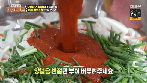 22. 양념에 열무를 넣고, 반절 남겨뒀던 양념장을 부어줍니다.