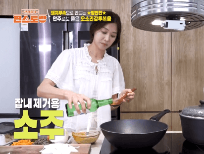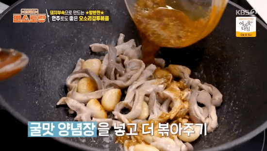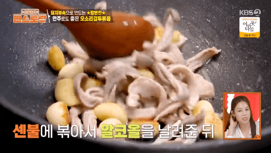 7. 오소리감투를 넣고 소주 1큰술을 넣고 강불에 볶아 알코올을 날려줍니다.