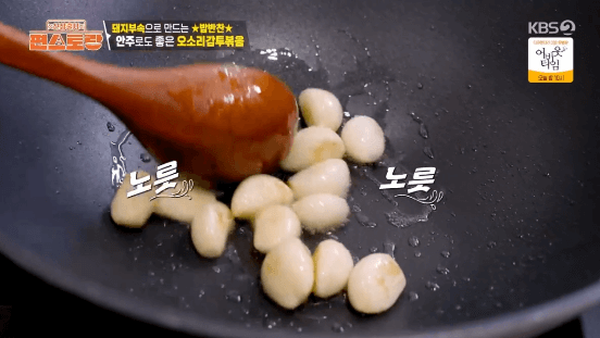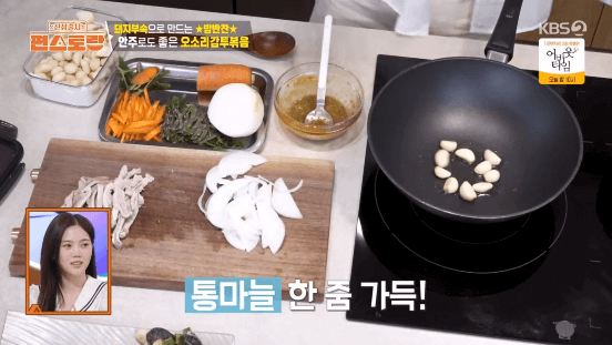 6. 달군 팬에 식용유를 두르고, 통마늘 10개를 볶아줍니다.