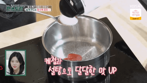 9. 냄비에 케첩 1큰술, 설탕 1큰술, 물 7큰술, 전분물 1큰술을 넣고 중불에 끓여줍니다.