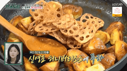 8. 허니버터 소스에 튀겨진 고구마, 연근을 넣고 빠르게 버무려줍니다.