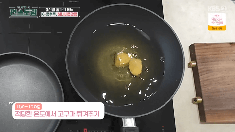 3. 웍에 식용유를 넉넉히 붓고 달궈서, 고구마를 160~170도 중불에서 5분 정도 튀기고 건져냅니다.