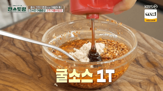 10. 고추기름에 치킨파우더 2/3큰술, 굴소스 1큰술을 넣어줍니다.