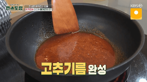 4. 팬에 식용유를 두르고, 고운 고춧가루 3큰술을 넣고 중불에서 저어가면서 고추기름을 만듭니다.