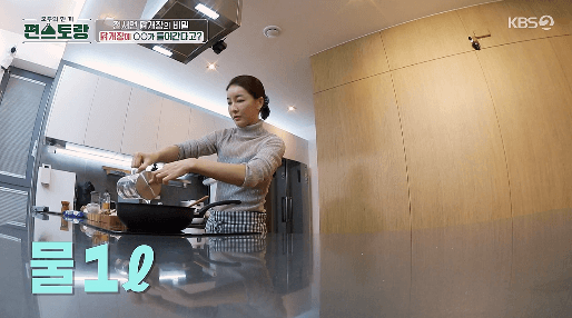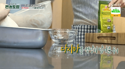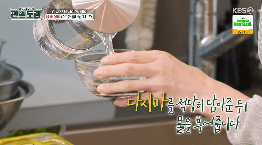 9. 다시마 우린 물 1리터를 부어줍니다. 진서연씨는 전자레인지를 이용해서 다시마 국물을 만들고, 물을 추가로 부어줬습니다. (3번의 다시마 우린 물 만드는 과정을 참고하세요.)