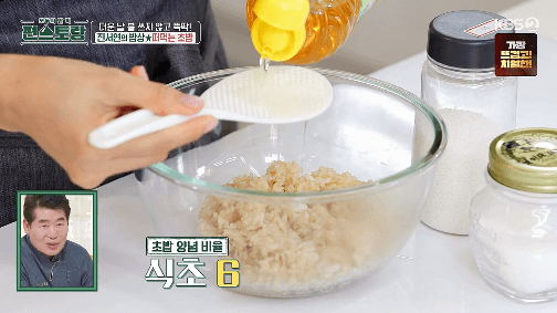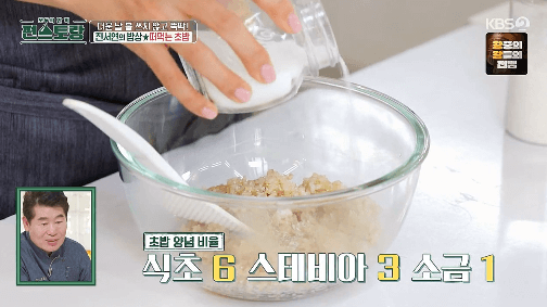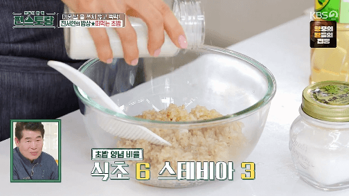 12. 현미밥을 볼에 담고, 양조식초, 스테비아, 소금을 넣고 잘 섞어줍니다. (양조식초 : 스테비아 : 소금을 6 : 3 : 1 비율로 넣습니다.)