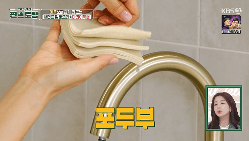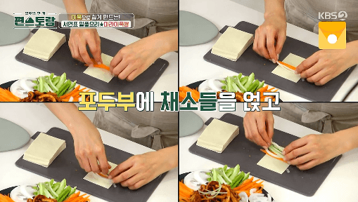진서연씨가 같이 작품을 하는 배우들에게 도시락으로 줄 음식을 요리했습니다. 그중 하나가 마라어묵쌈인데, 두부포에 야채와 마라소스에 볶은 어묵을 싸서 먹는 요리입니다. 도시락용이라 먹기 편하게 데친 부추로 두부포를 묶어줬는데요. 집에서 먹을 때는 그냥 편하게 두부포에 싸서 먹으면 됩니다.