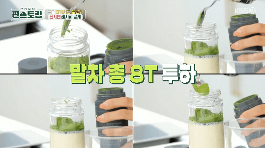 2. 말차 가루 8스푼을 넣습니다. 보통은 4스푼을 넣지만, 진서연씨는 다이어트를 위해서 8스푼을 넣는다고 합니다. 카페인 성분이 있기 때문에 본인에 맞는 적절한 양을 넣도록 합니다.