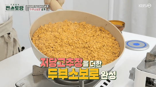 소보로는 생선, 닭고기, 새우 등을 으깨고, 양념한 후 볶아서 만든 것입니다. 소보로빵에 붙어 있는 작은 덩어리들을 생각하면 되겠습니다. 이번 시간에는 이 소보로를 두부로 만들어 보겠습니다. 이름하여 두부소보로. 그리고, 두부소보로를 활용한 요리로 두부소보로덮밥과 통오이김밥 만들어보겠습니다. 3가지를 만듭니다. 놓치지 마세요.