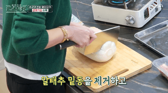 3. 알배추 밑동을 제거하고, 수육을 싸 먹기 좋은 크기로 잘라줍니다. 반절 정도로 자르면 됩니다.
