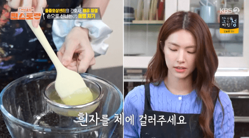 2. 흰자를 체에 걸러서, 알끈을 제거해줍니다.