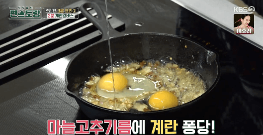 6. 마늘이 갈색으로 변하기 시작하면, 계란 4개를 깨서 넣고 맛소금을 계란 위에 뿌려줍니다.