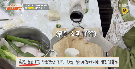 7. 생강 1톨, 양파 1/2개, 대파 1대, 깐 마늘 30개, 삼계탕용 팩 1개, 굵은소금 1큰술을 넣습니다.