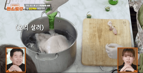 9. 뚜껑을 닫고 1시간 더 끓인 뒤, 건더기와 오리를 건져냅니다.