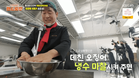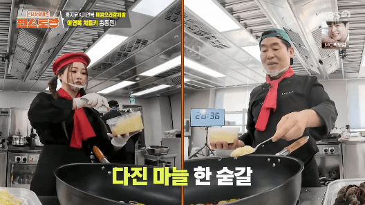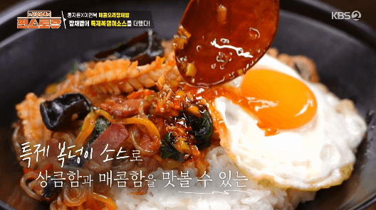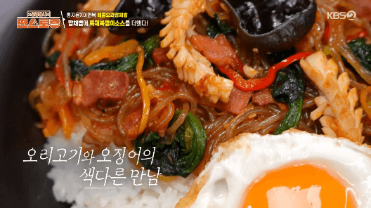 신입 편셰프 홍지윤씨가 이연복 셰프님과 팀을 이뤄 잡채밥을 만들었습니다. 훈제오리와 오징어가 들어가서 더욱 특별하고 맛있는 잡채밥입니다. 특제 복덩이소스와 같이 먹으면 더 좋아요.