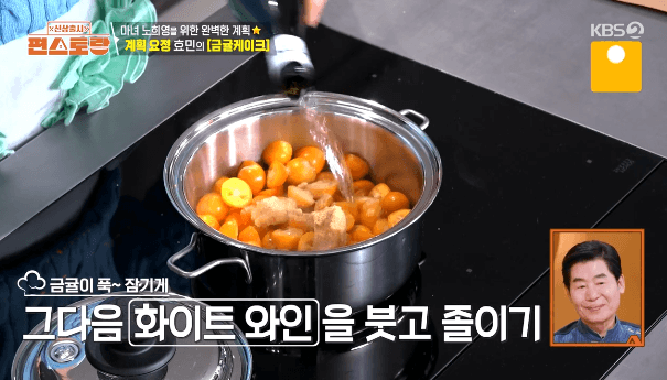 2. 손질한 금귤을 냄비에 넣고, 설탕과 화이트와인을 넣고 중약불에서 20분간 졸여줍니다. (금귤이 충분히 잠기도록 화이트 와인을 부어주고, 설탕은 취향껏 양을 조절합니다.)